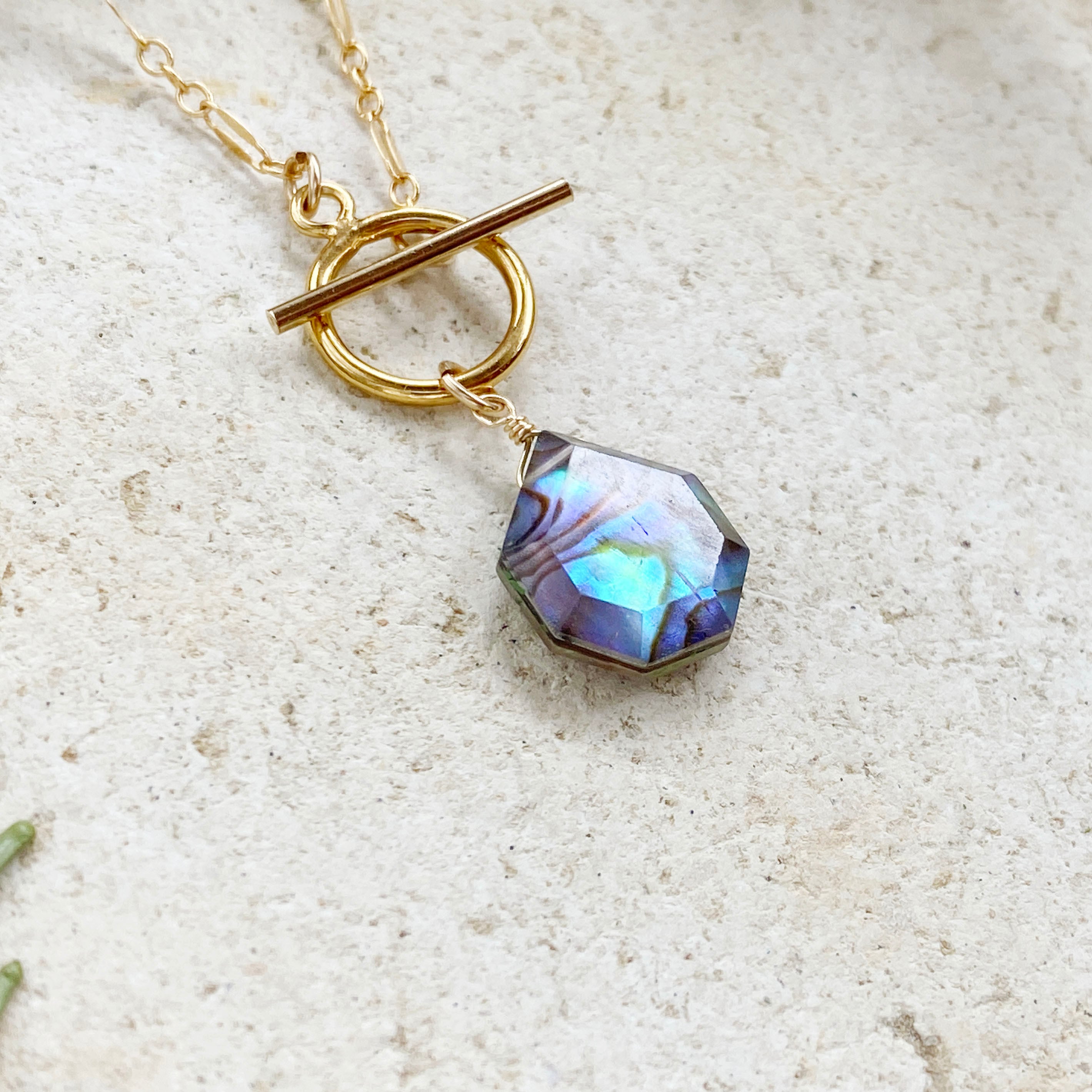 アバロンシェルの裏表にクリスタル(天然水晶)を合わせ、縁取りのようにカッティングが入りっているため、宝石のように美しく輝きます!