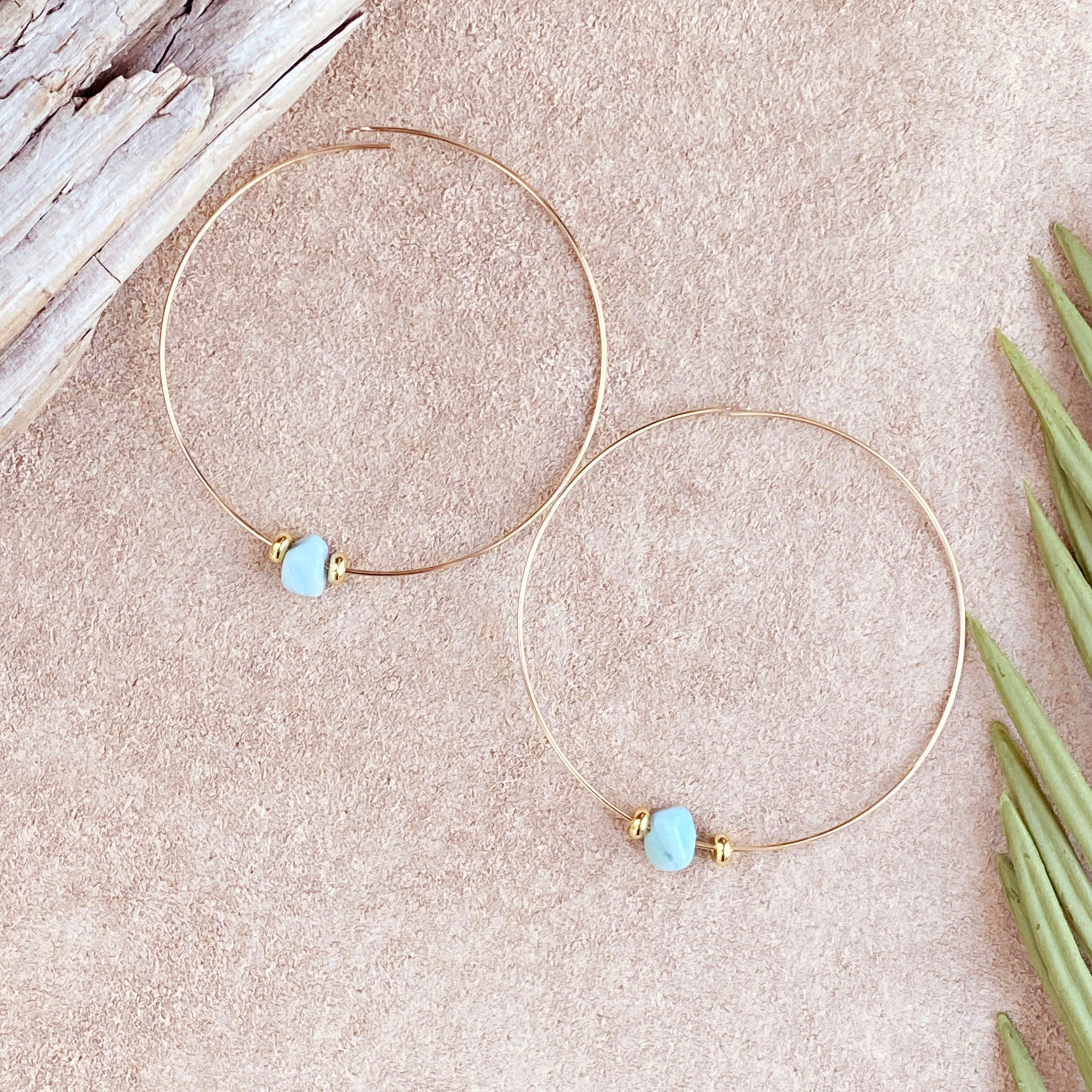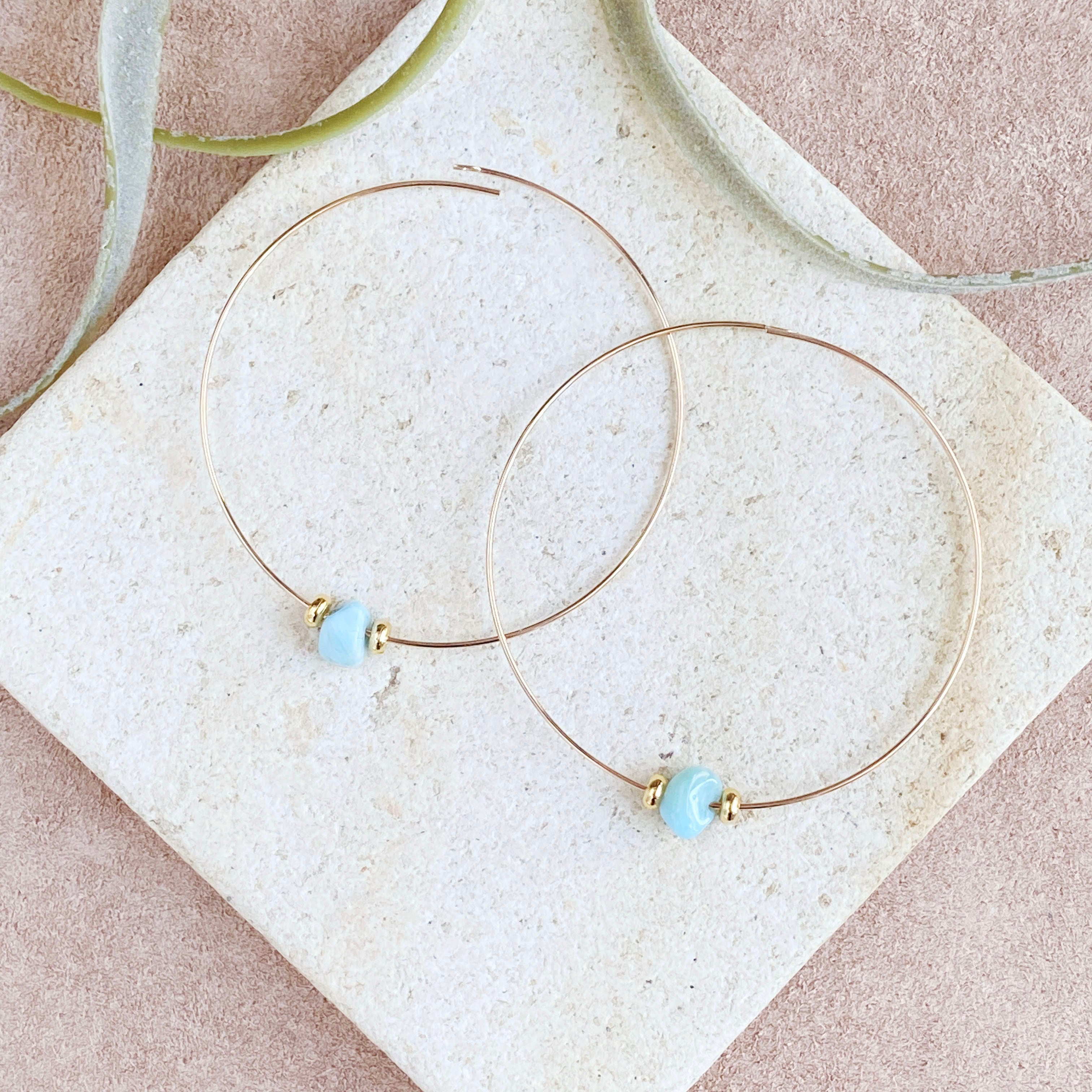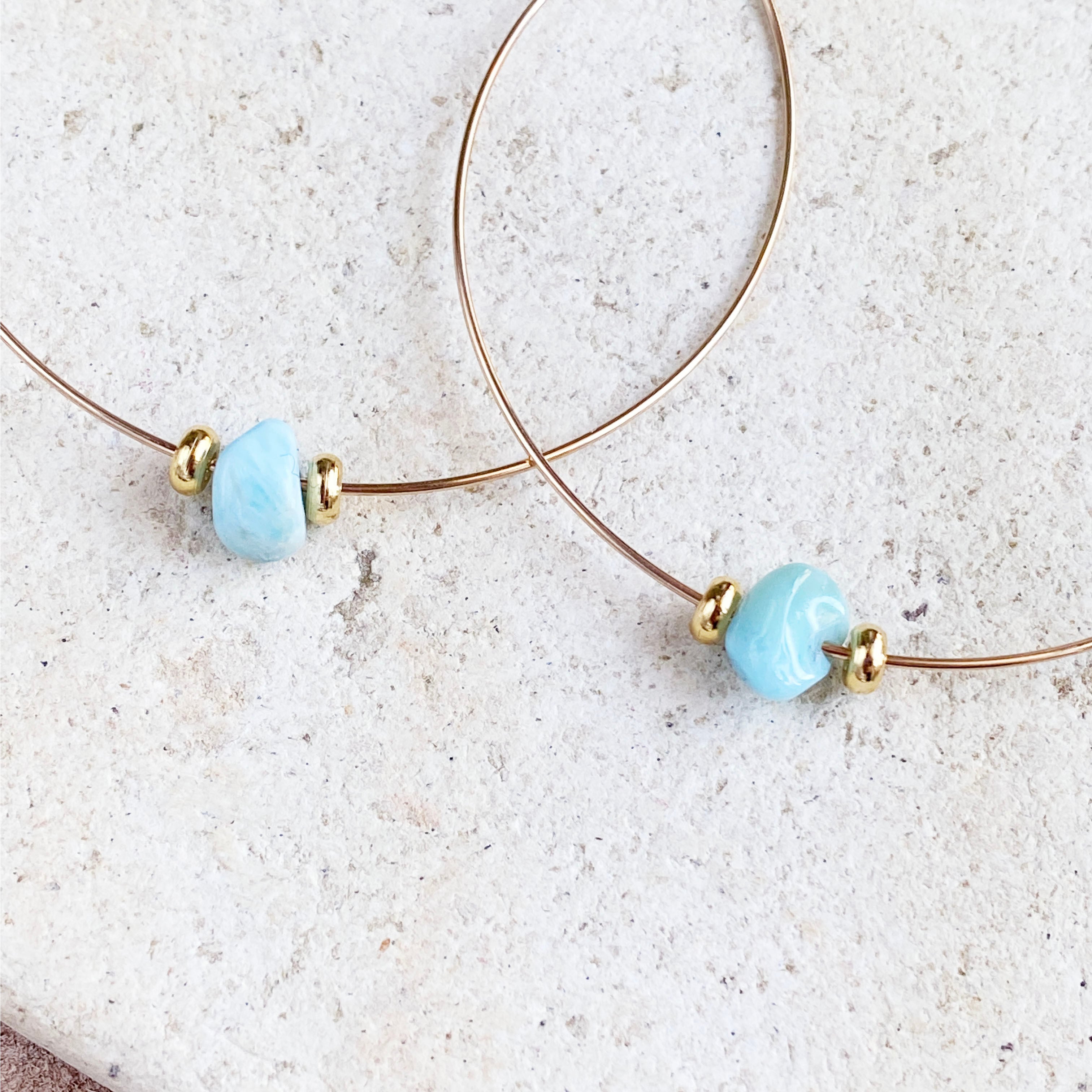 カリブ海に浮かぶ島国、ドミニカで採れる希少なラリマーをフープピアスに合わせました。