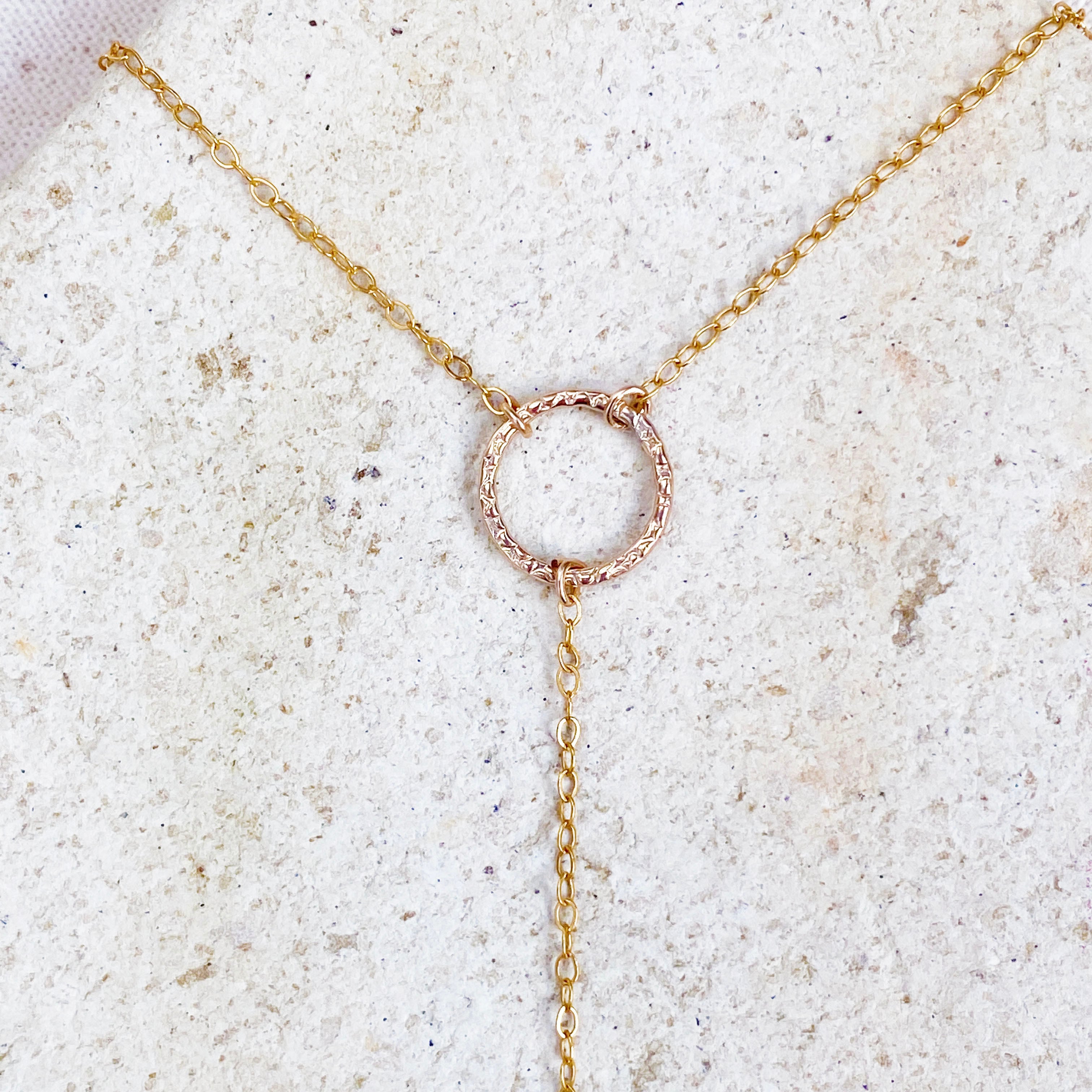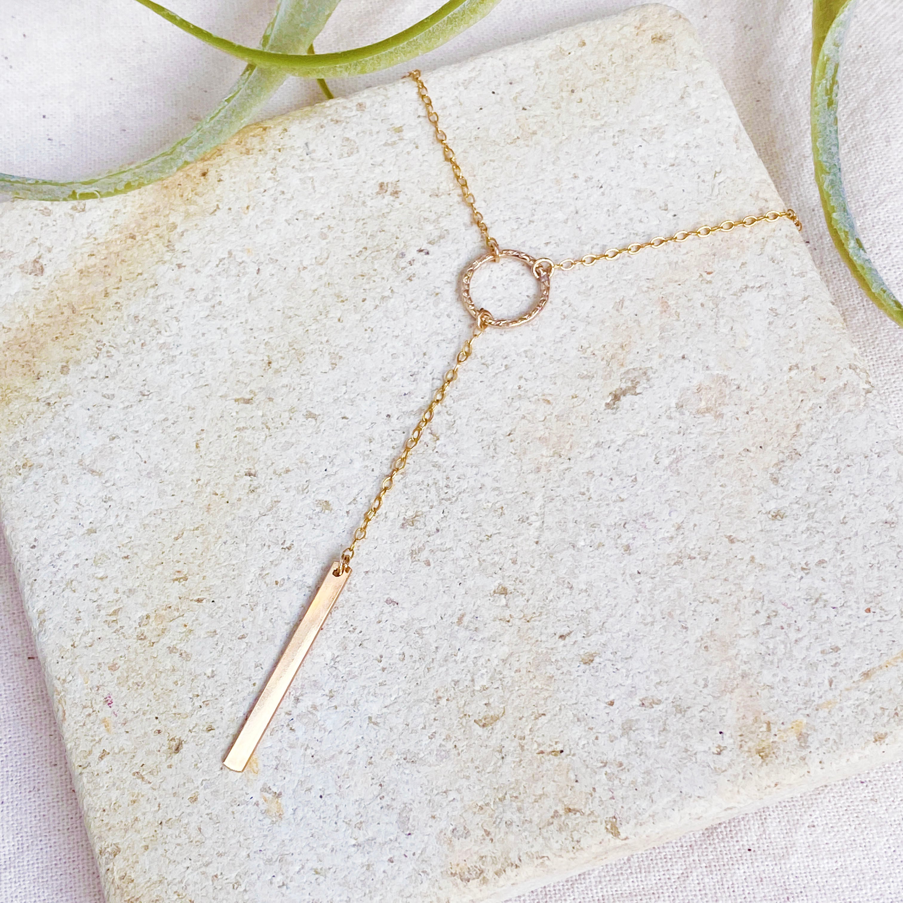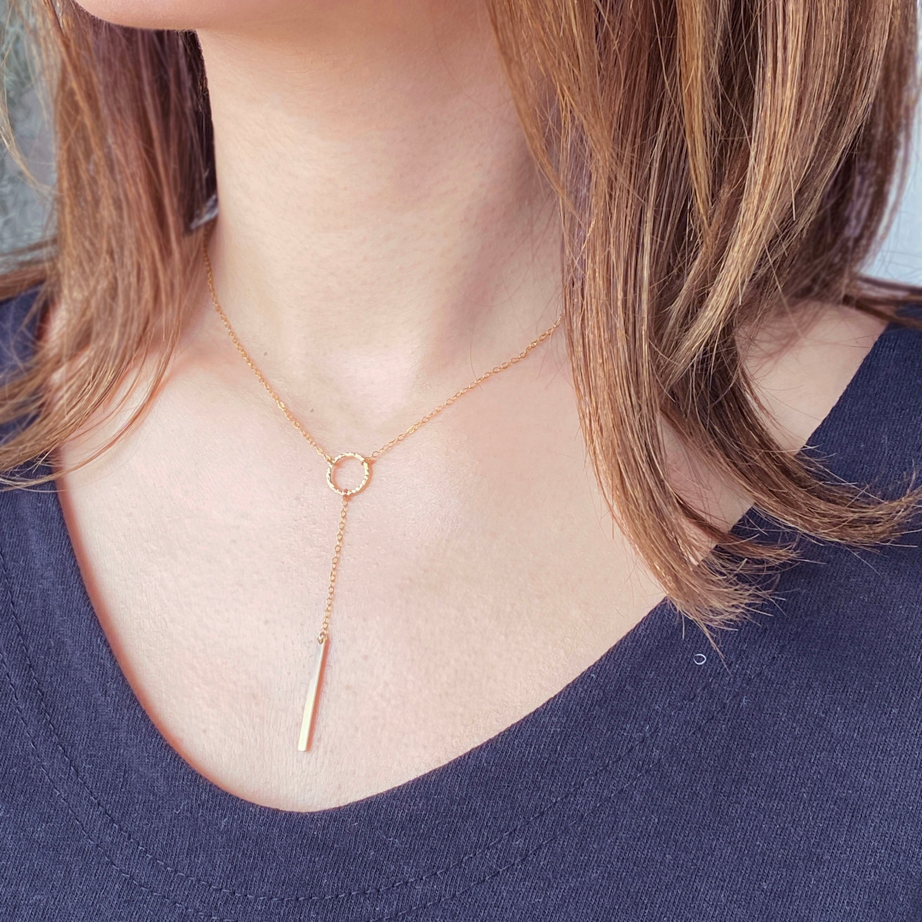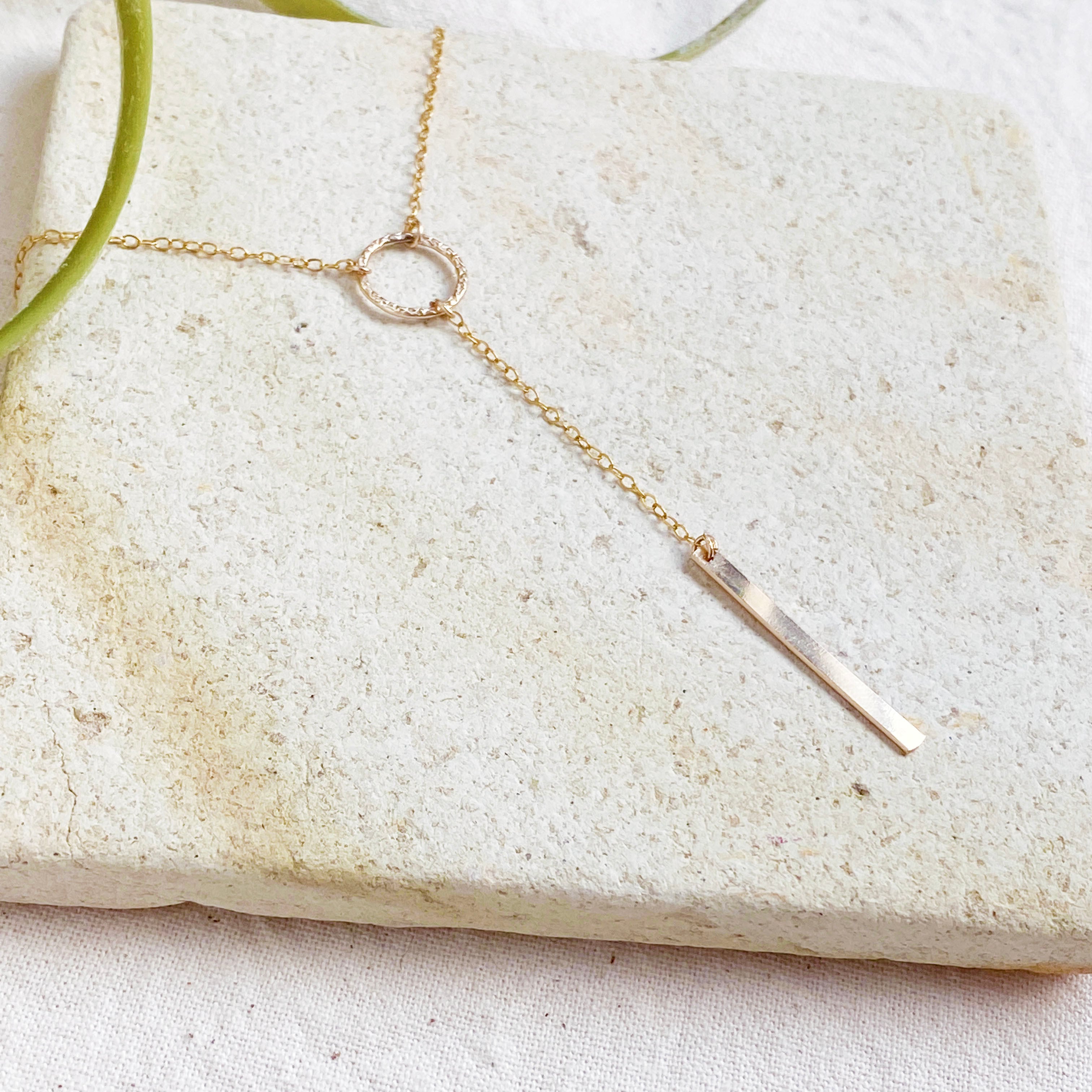 デザイン入りのリングとバー プレートを組み合わせたY字ネックレス。