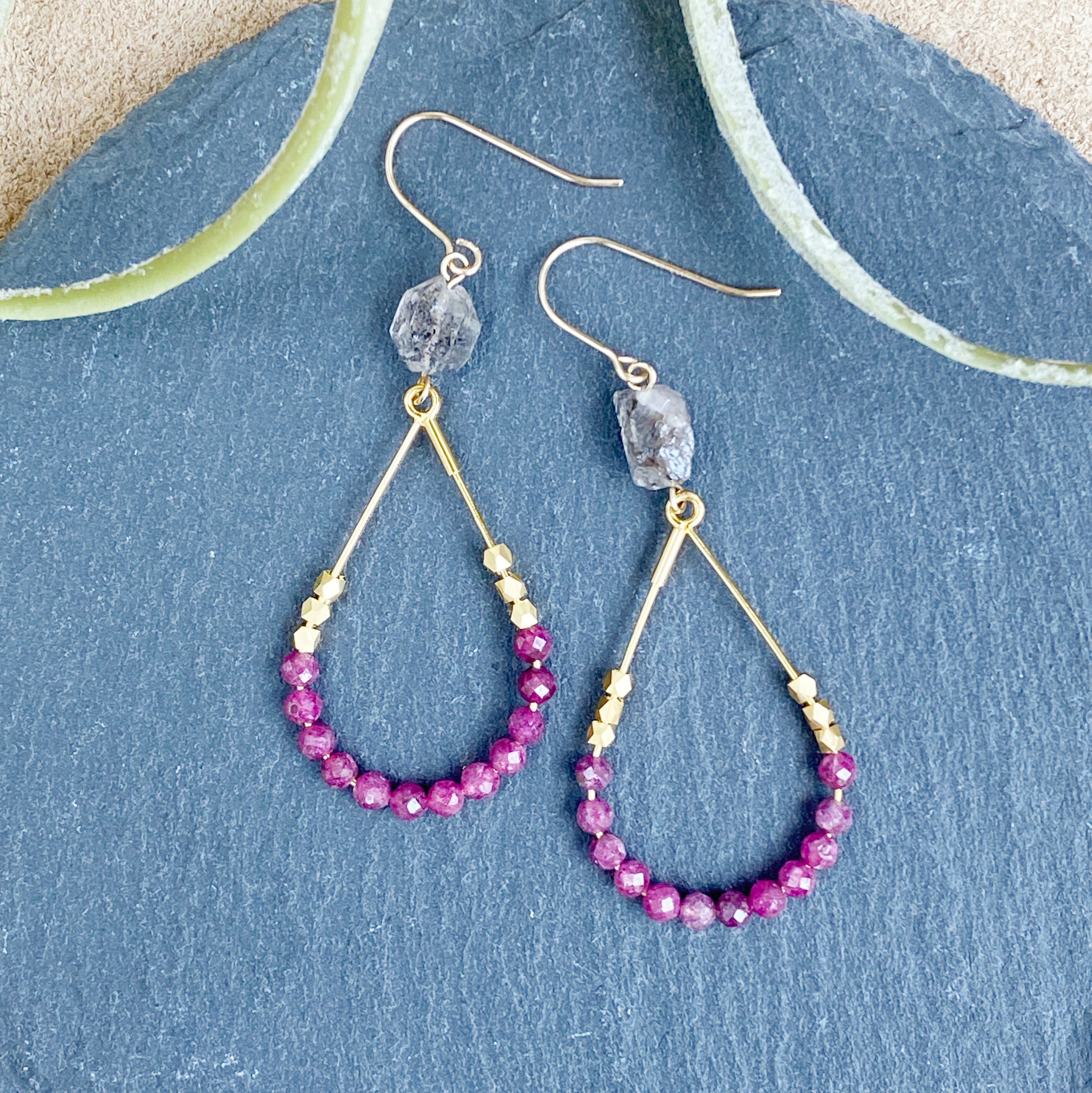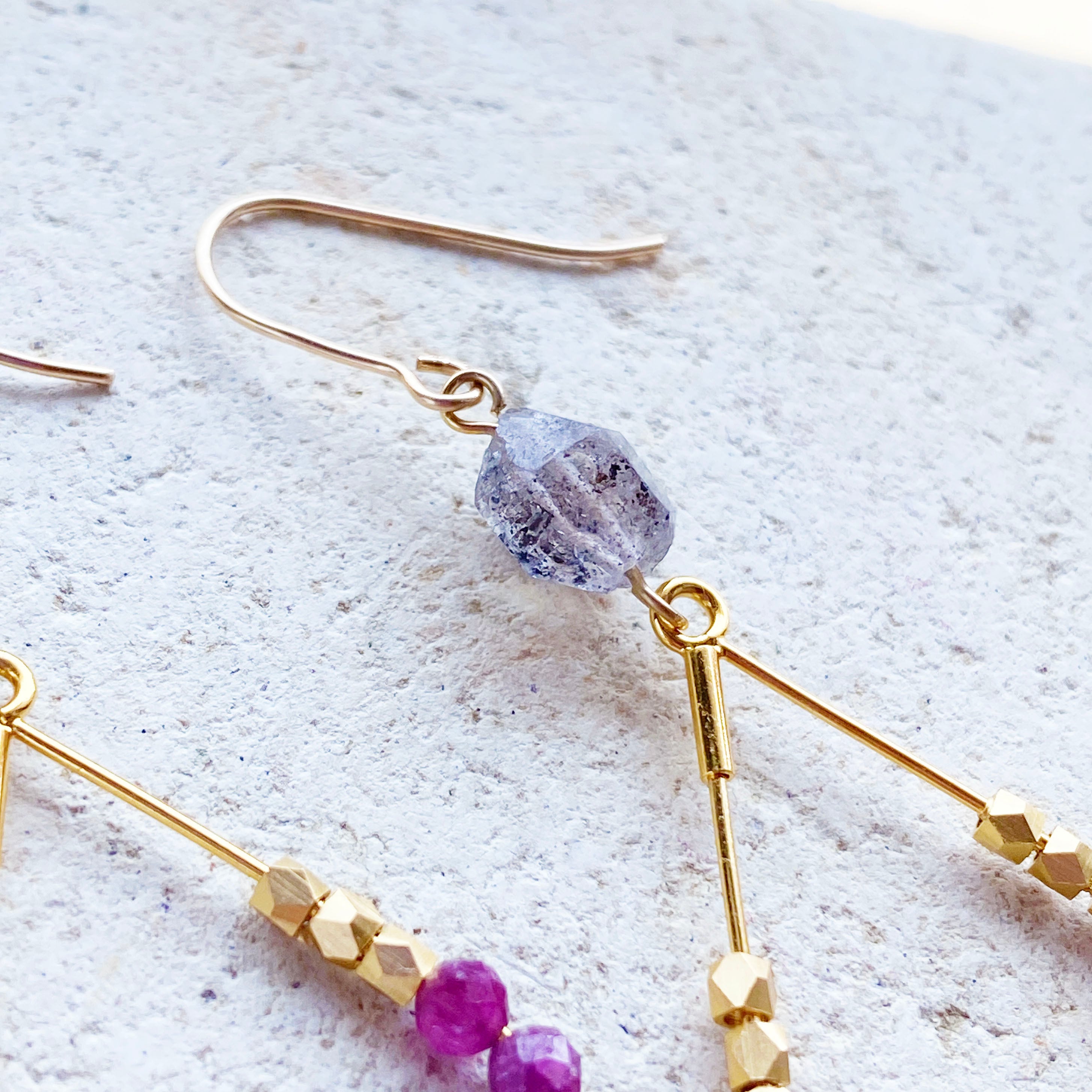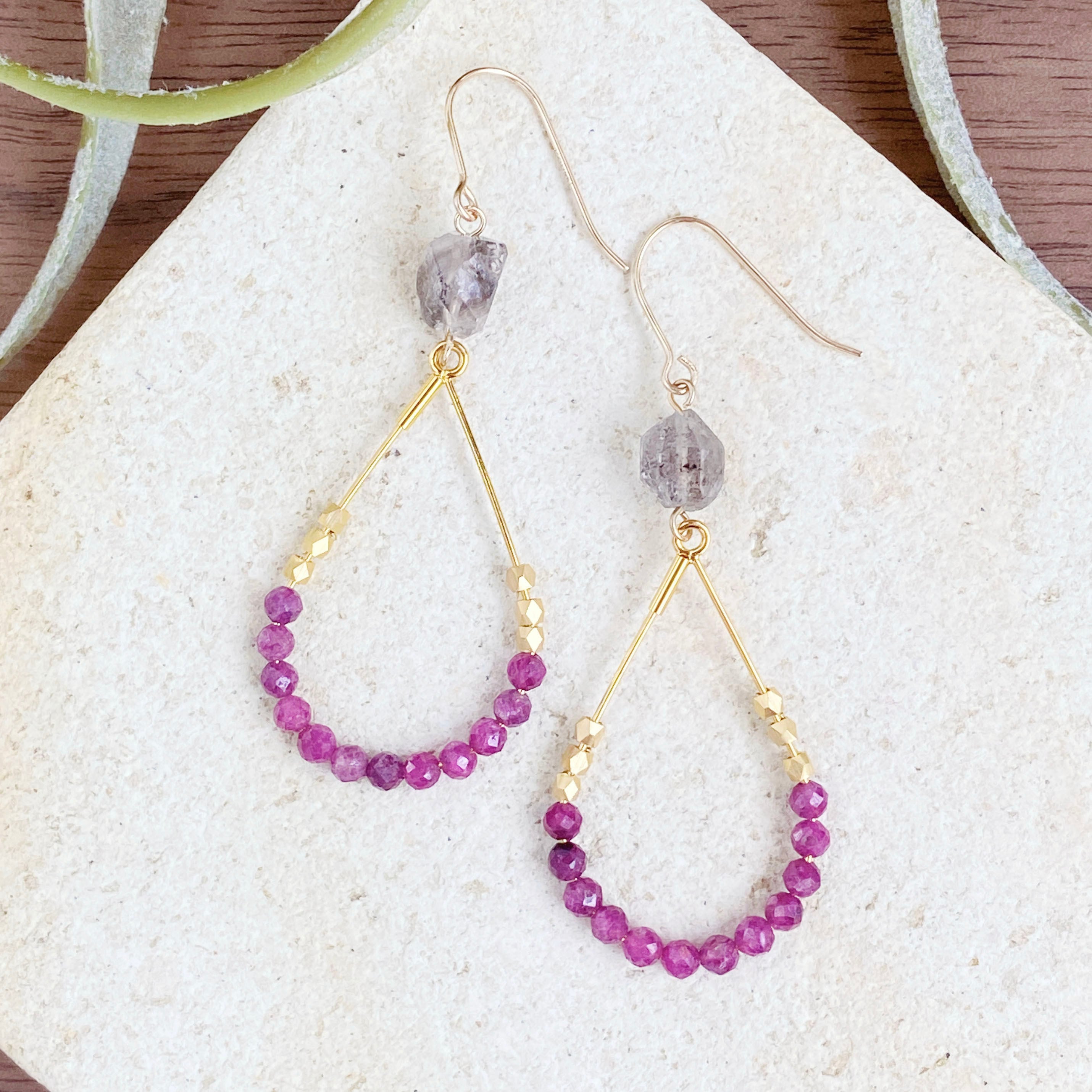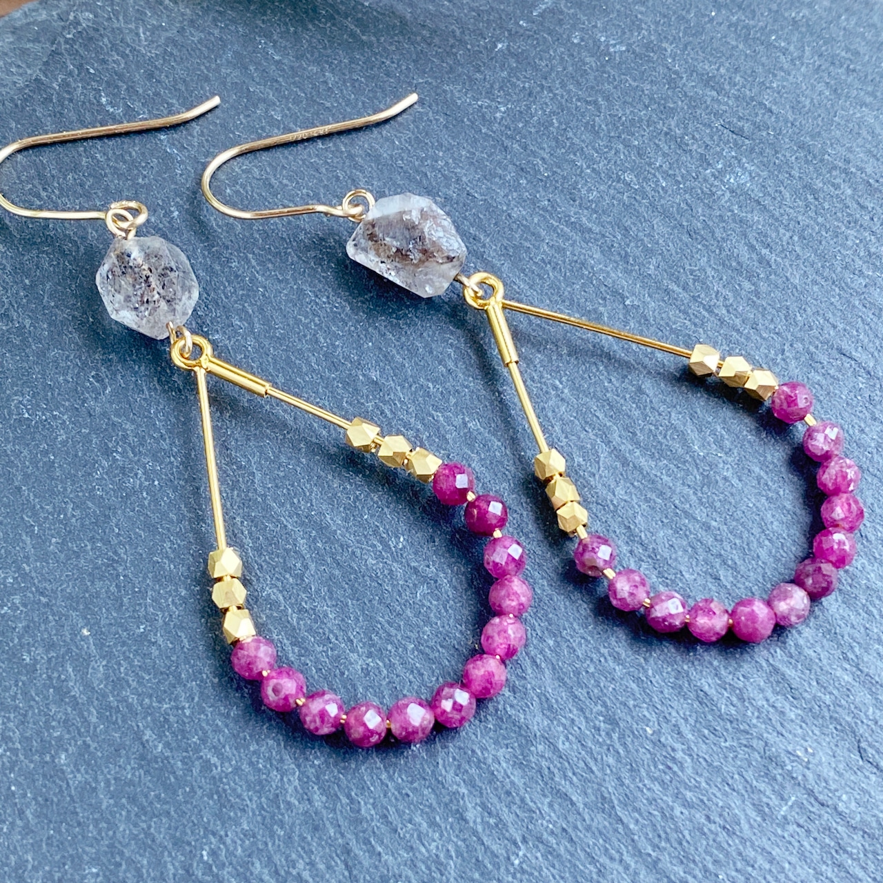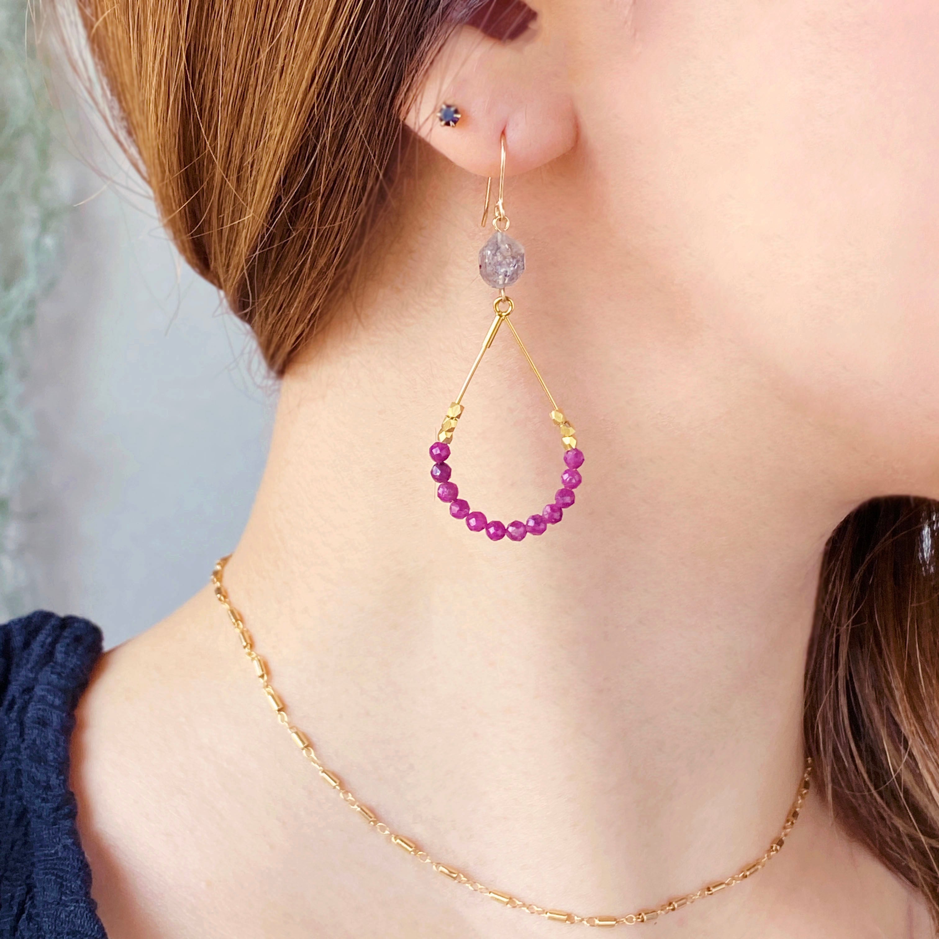 ルビーをあしらったドロップフープとダブブルポイントクリスタルの組み合わせです。