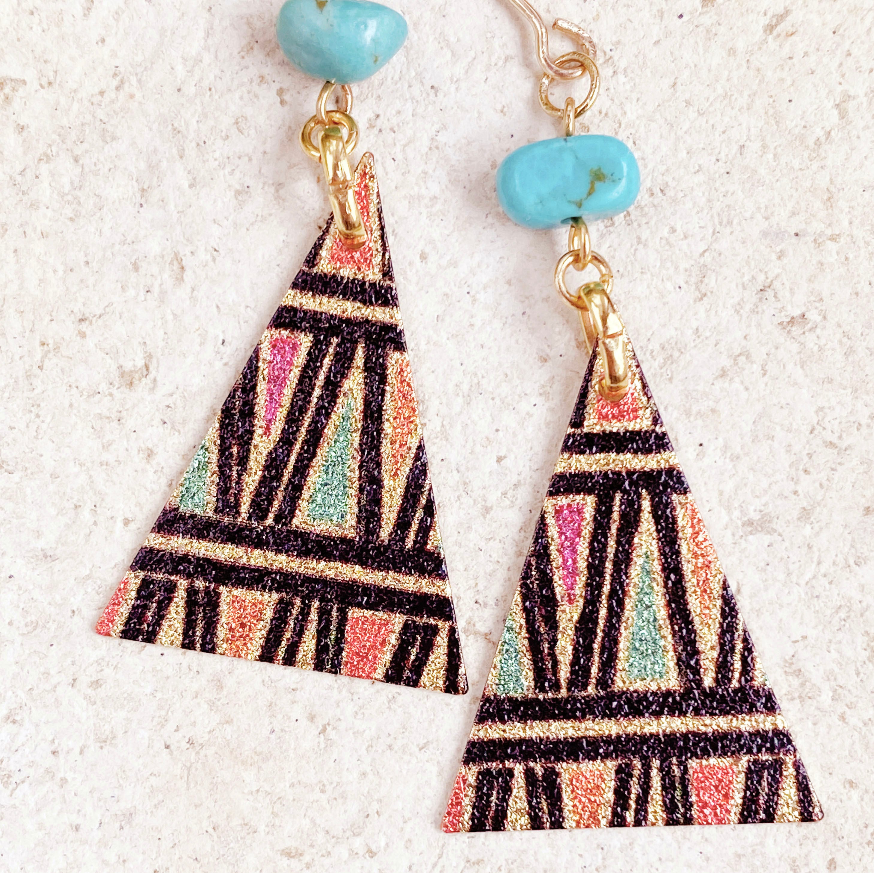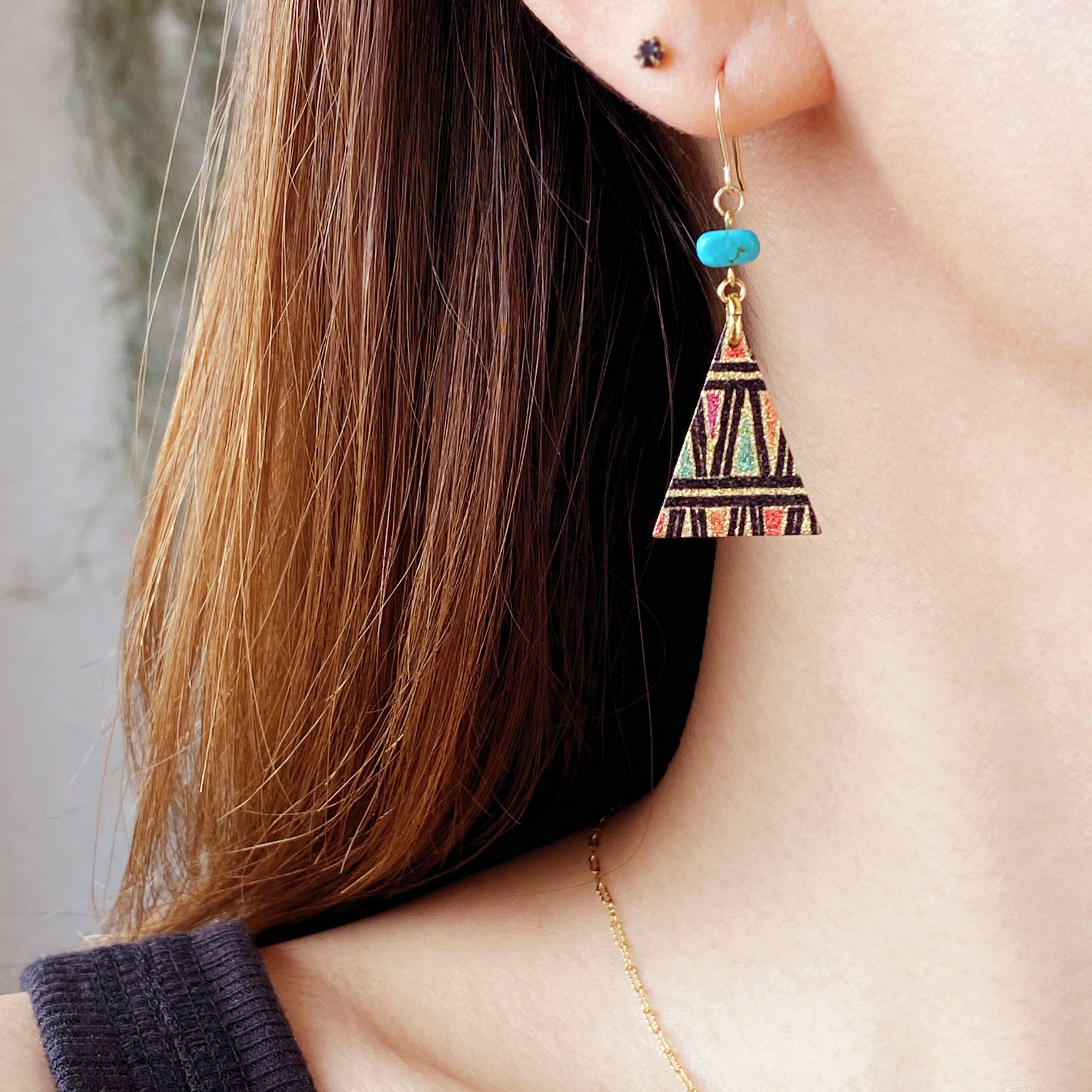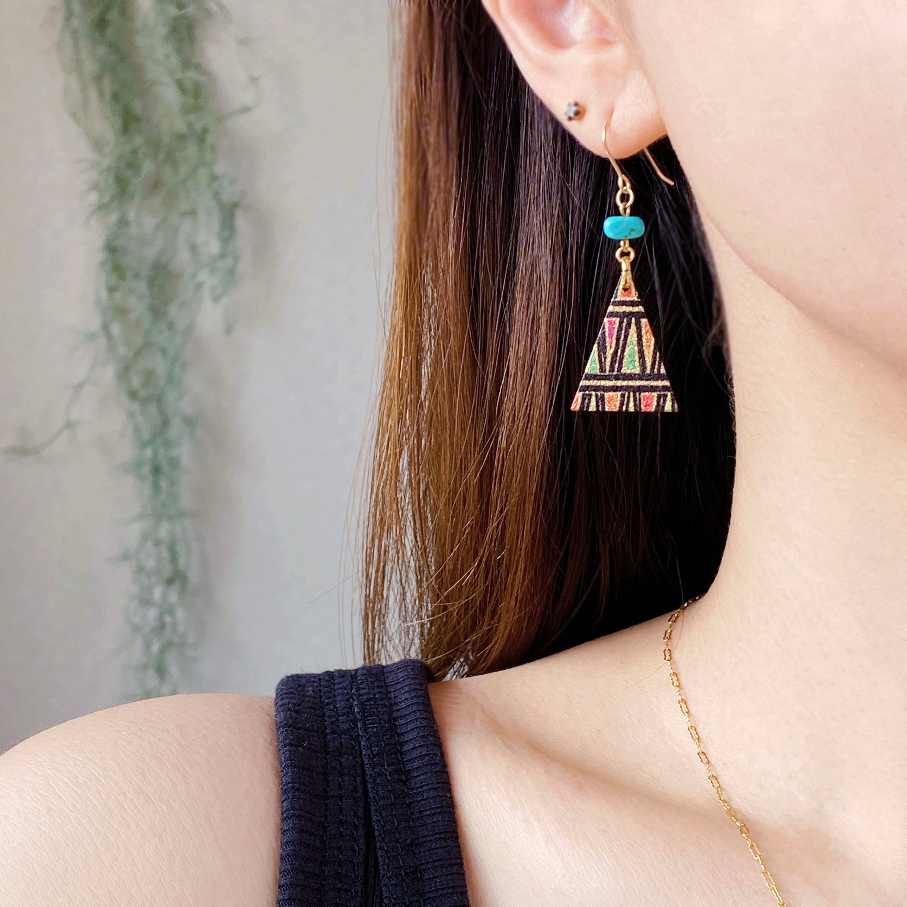 ターコイズとカラフルなトライアングルプレートのコンビネーションです。