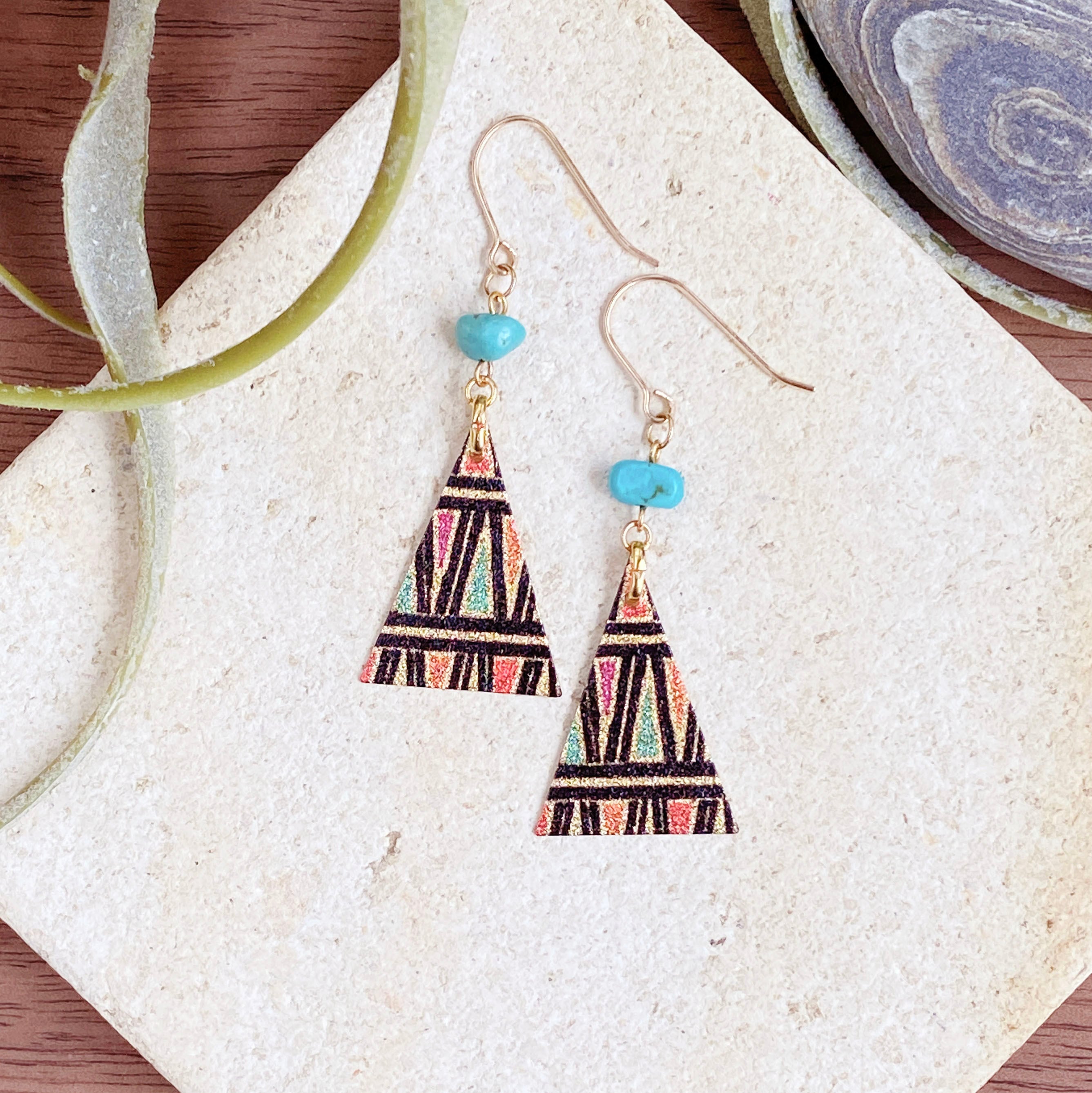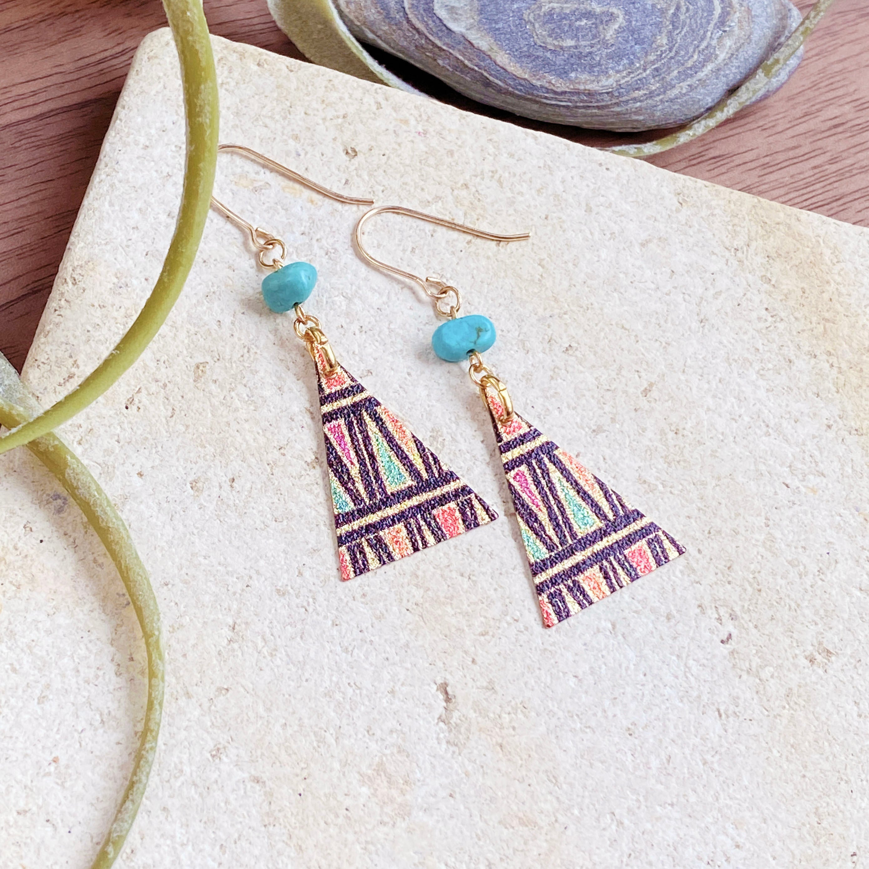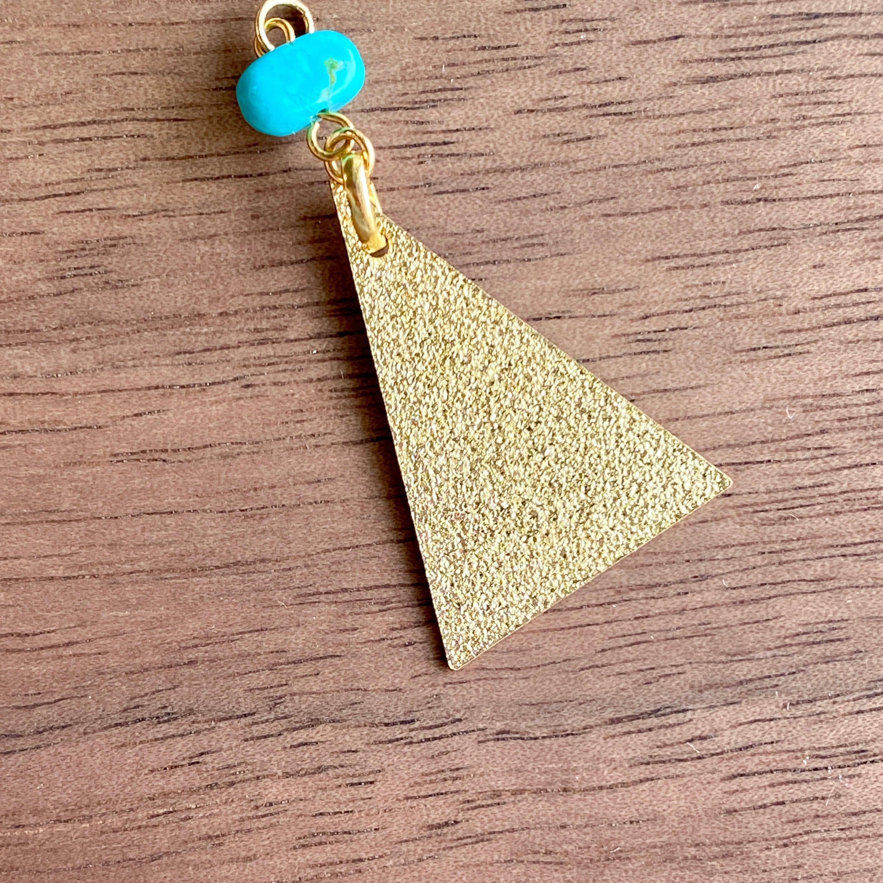 ターコイズとカラフルなトライアングルプレートのコンビネーションです。