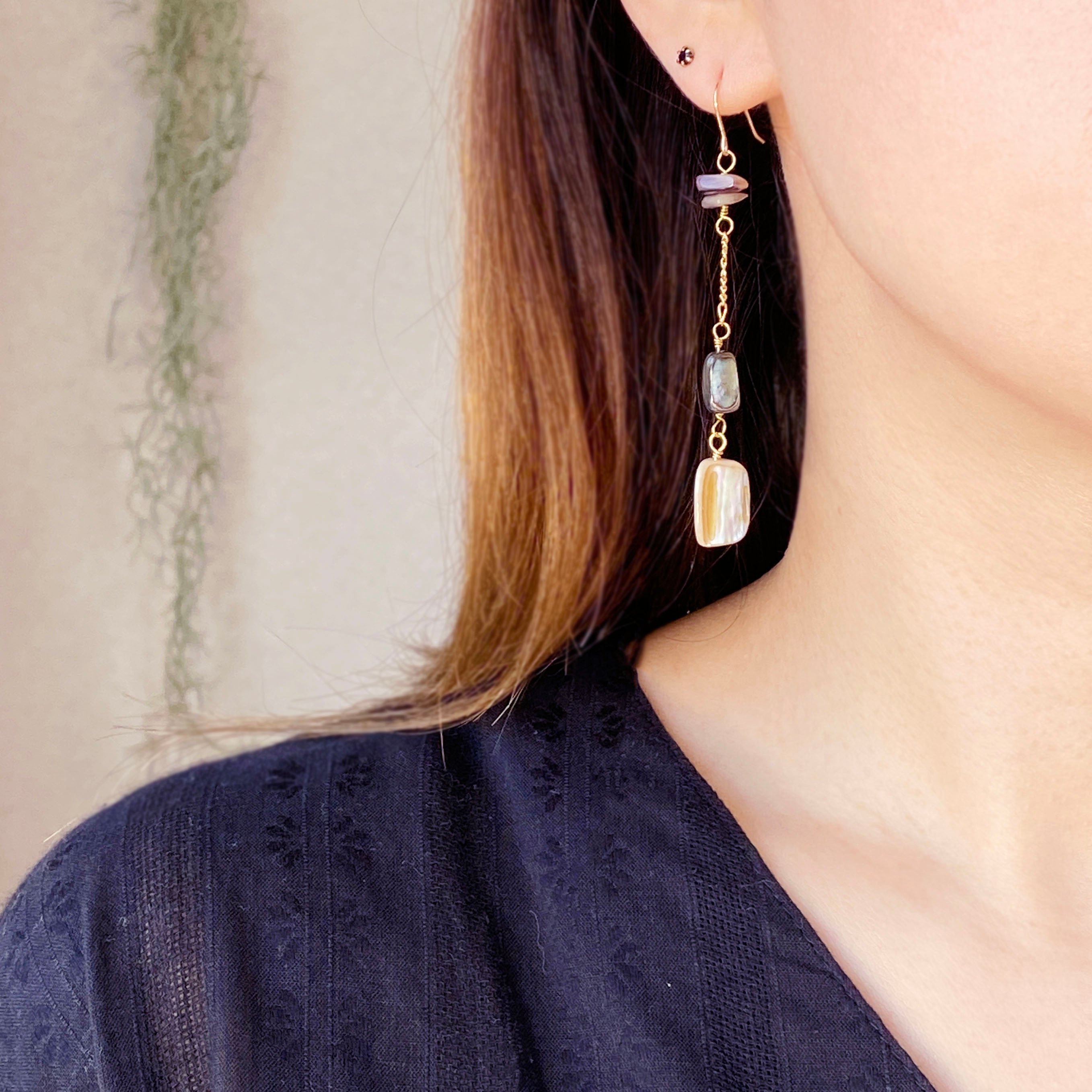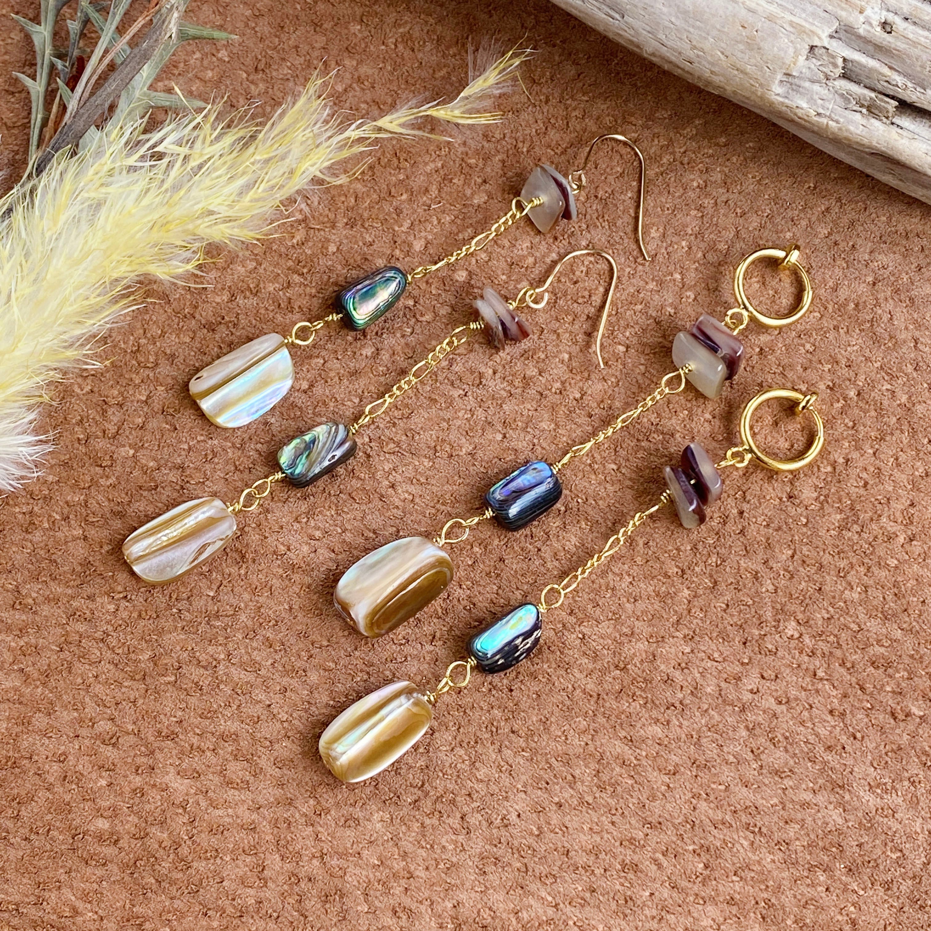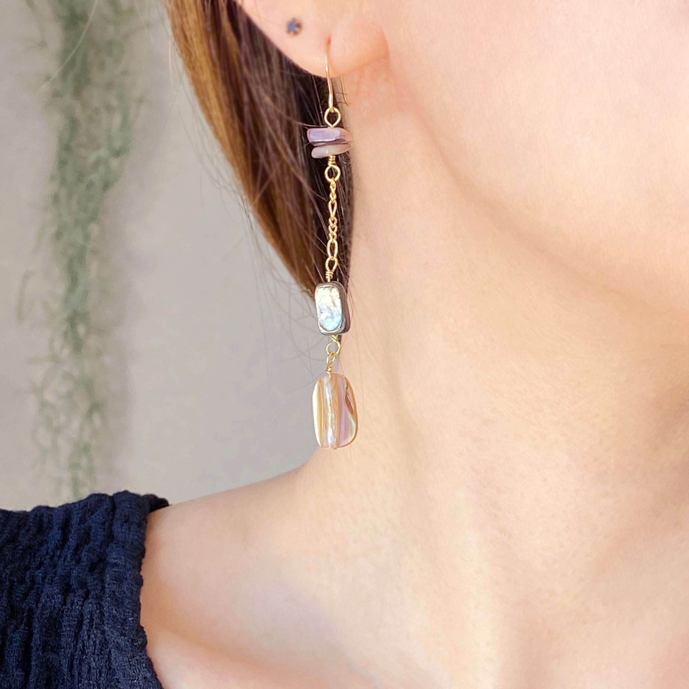 ナチュラルな風合いのmixシェル チェーンピアスです。