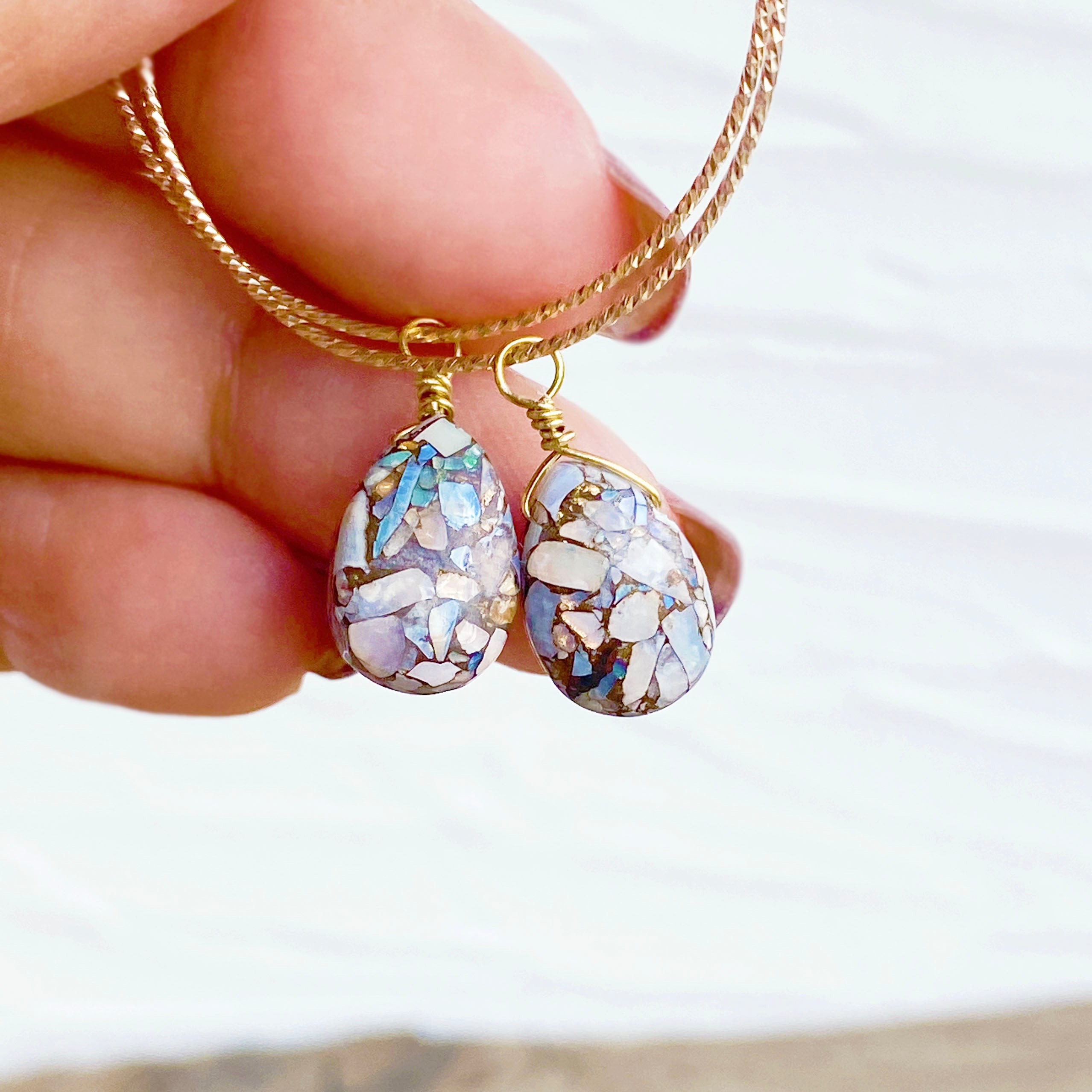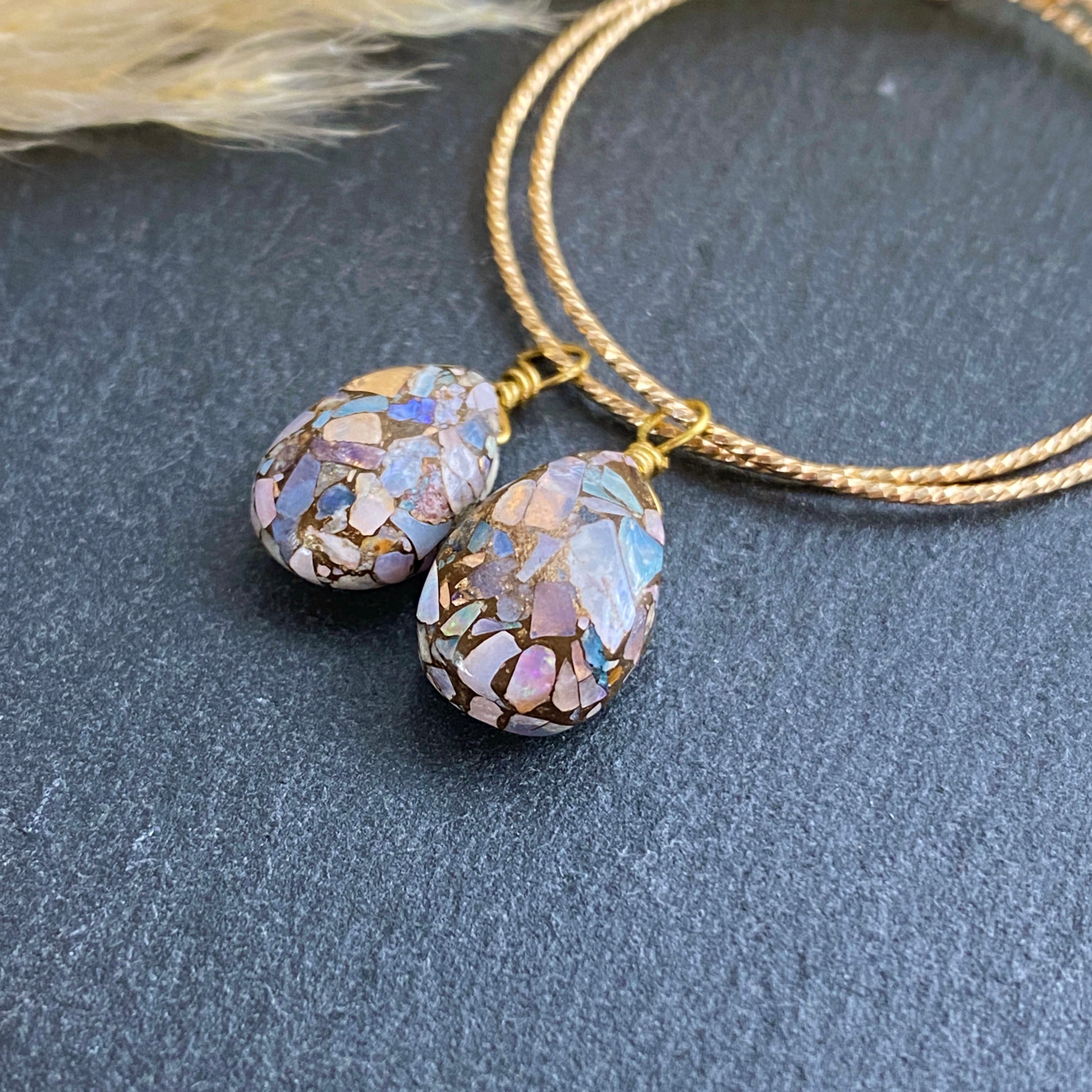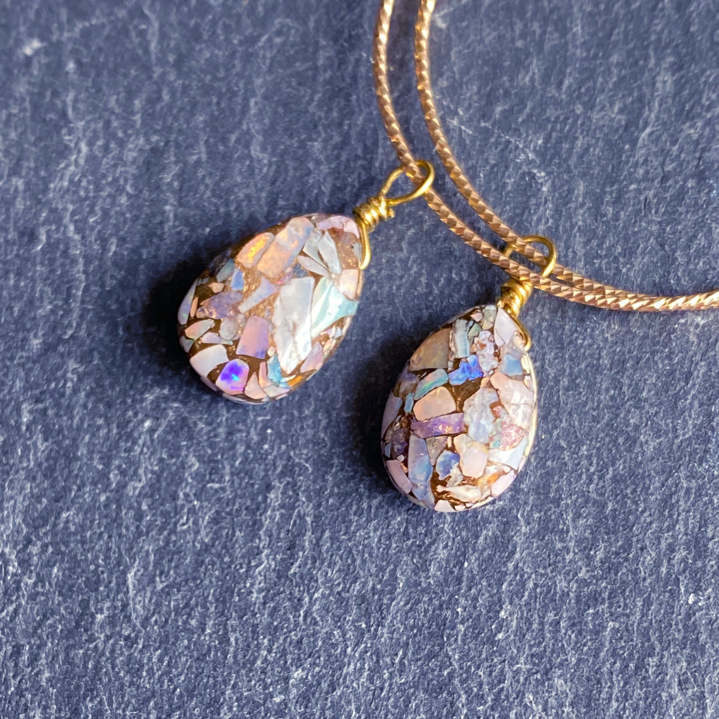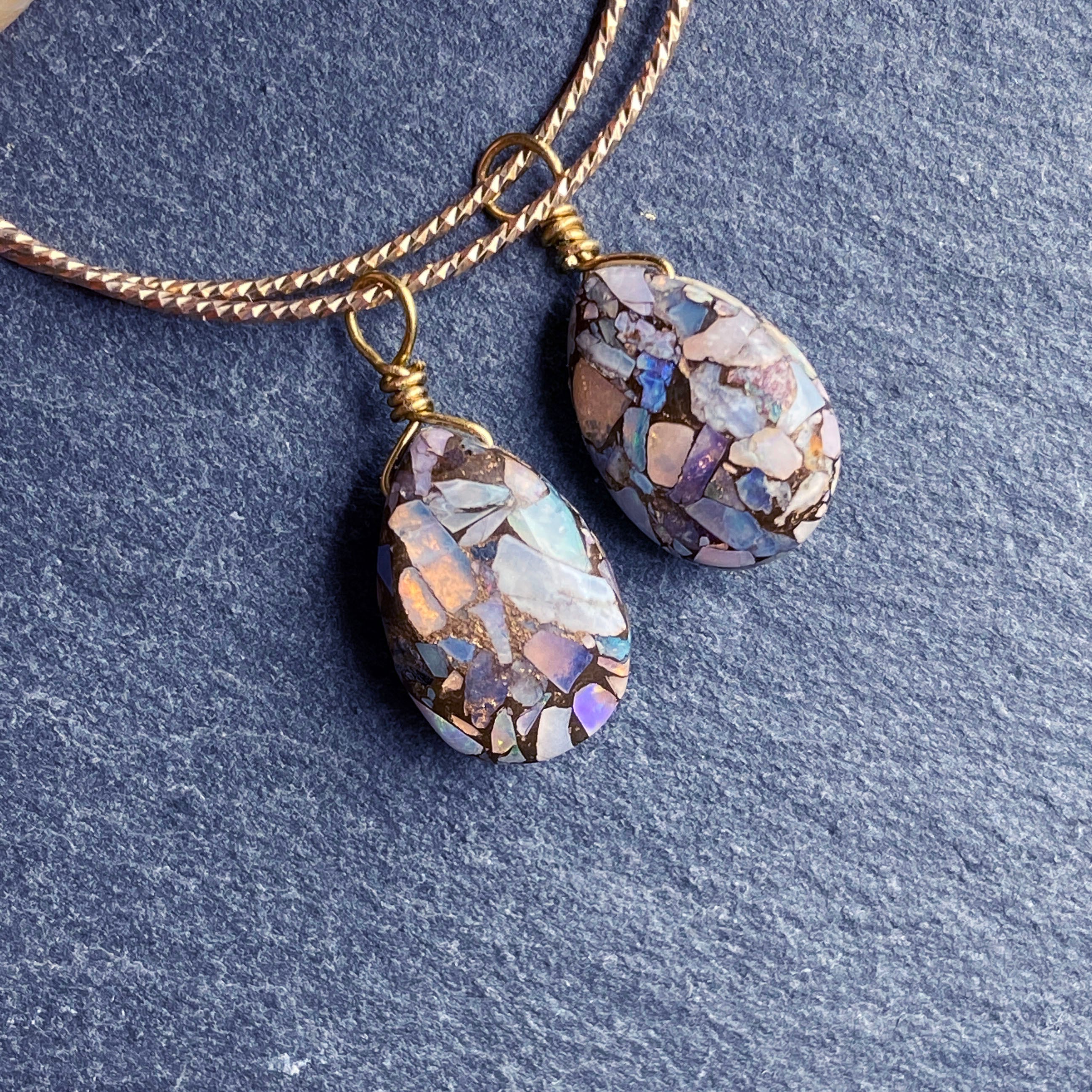 プレシャスオパールコッパーとはプレシャスオパールとコッパー(銅)を圧縮して貼り合わせたストーンです。