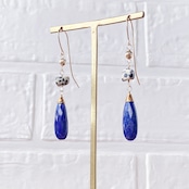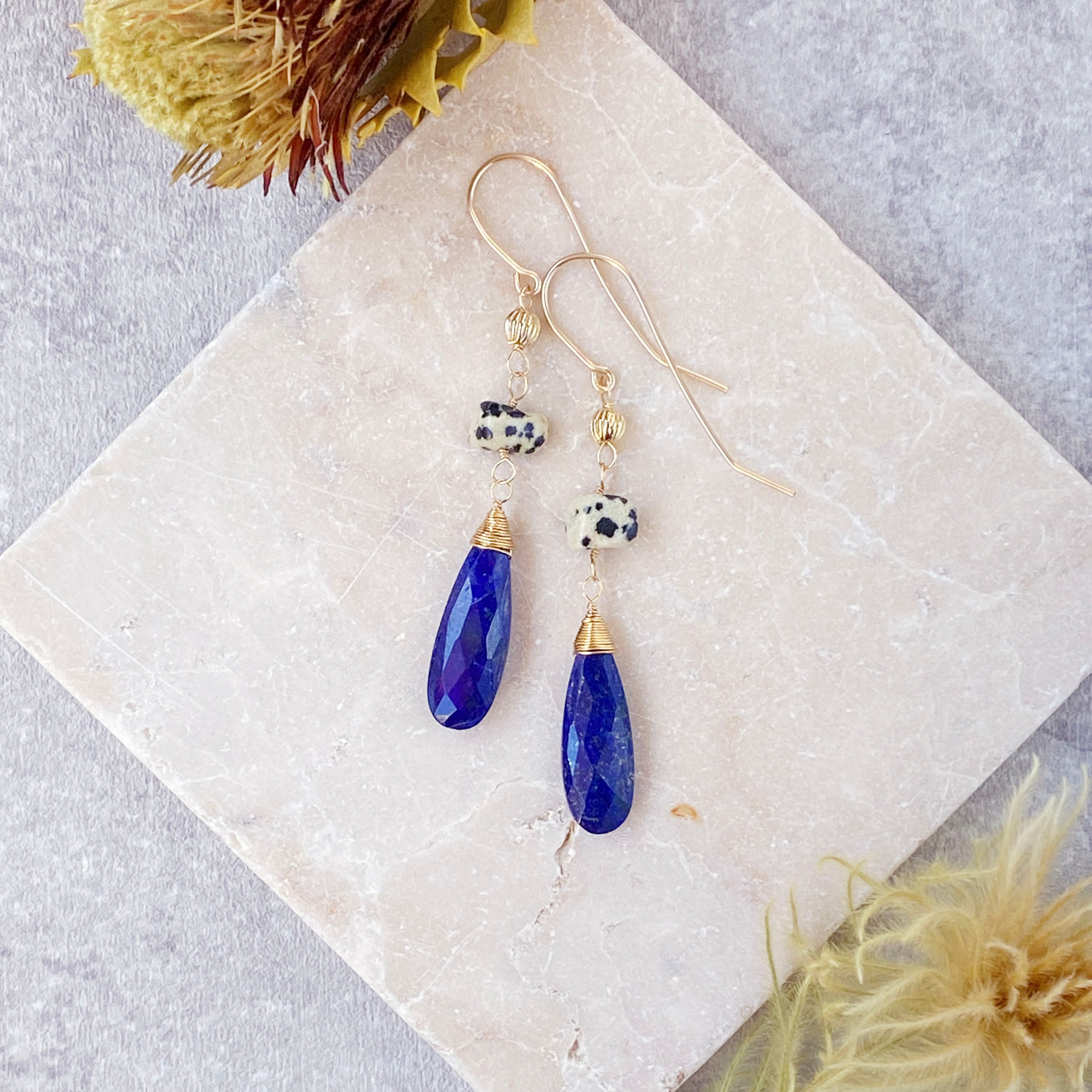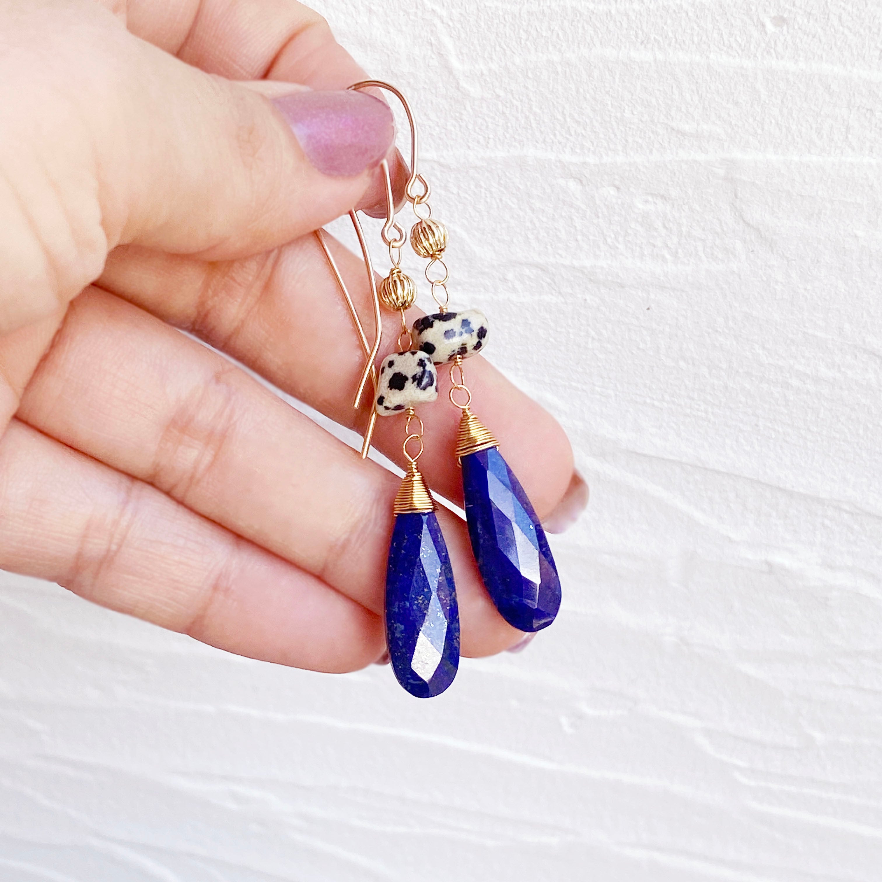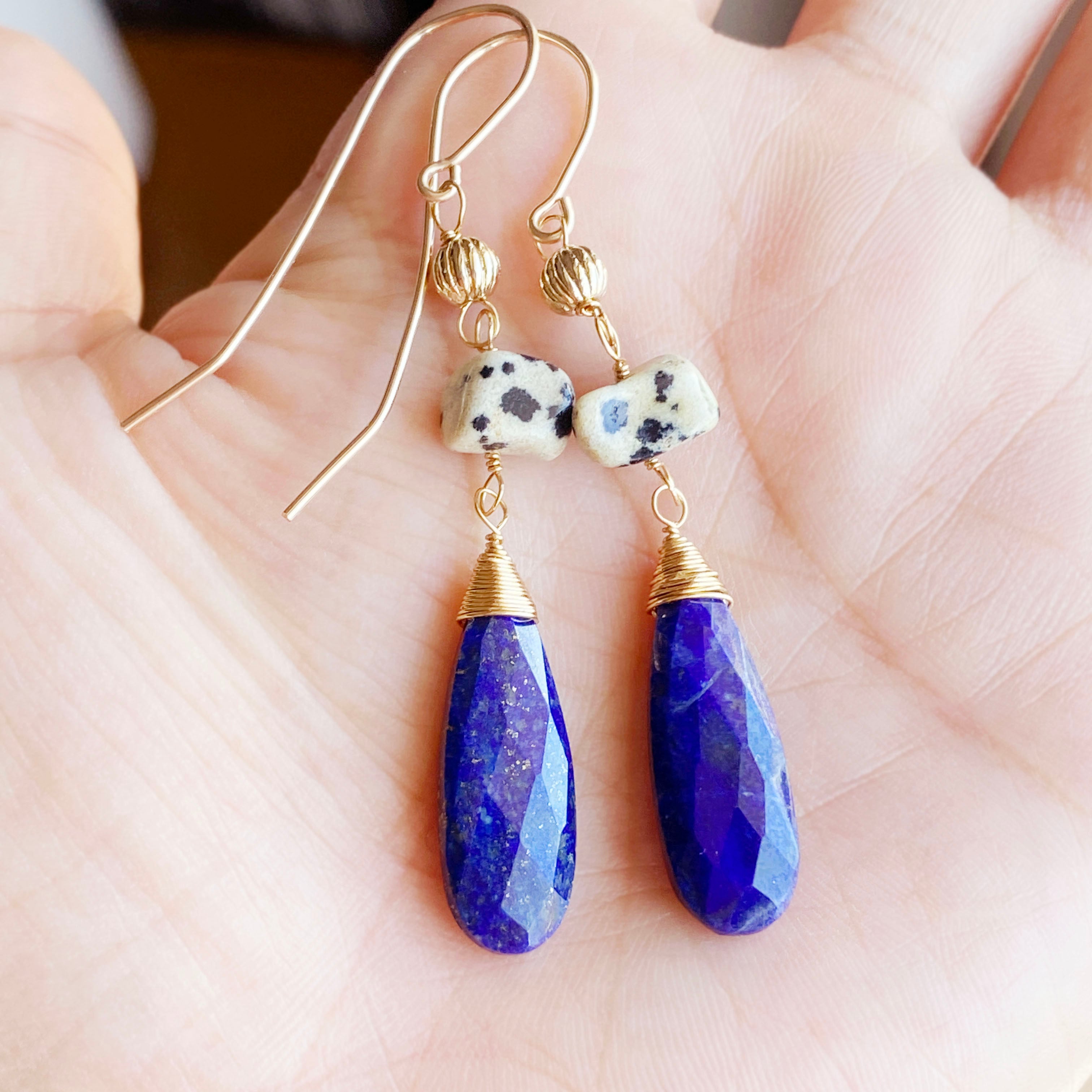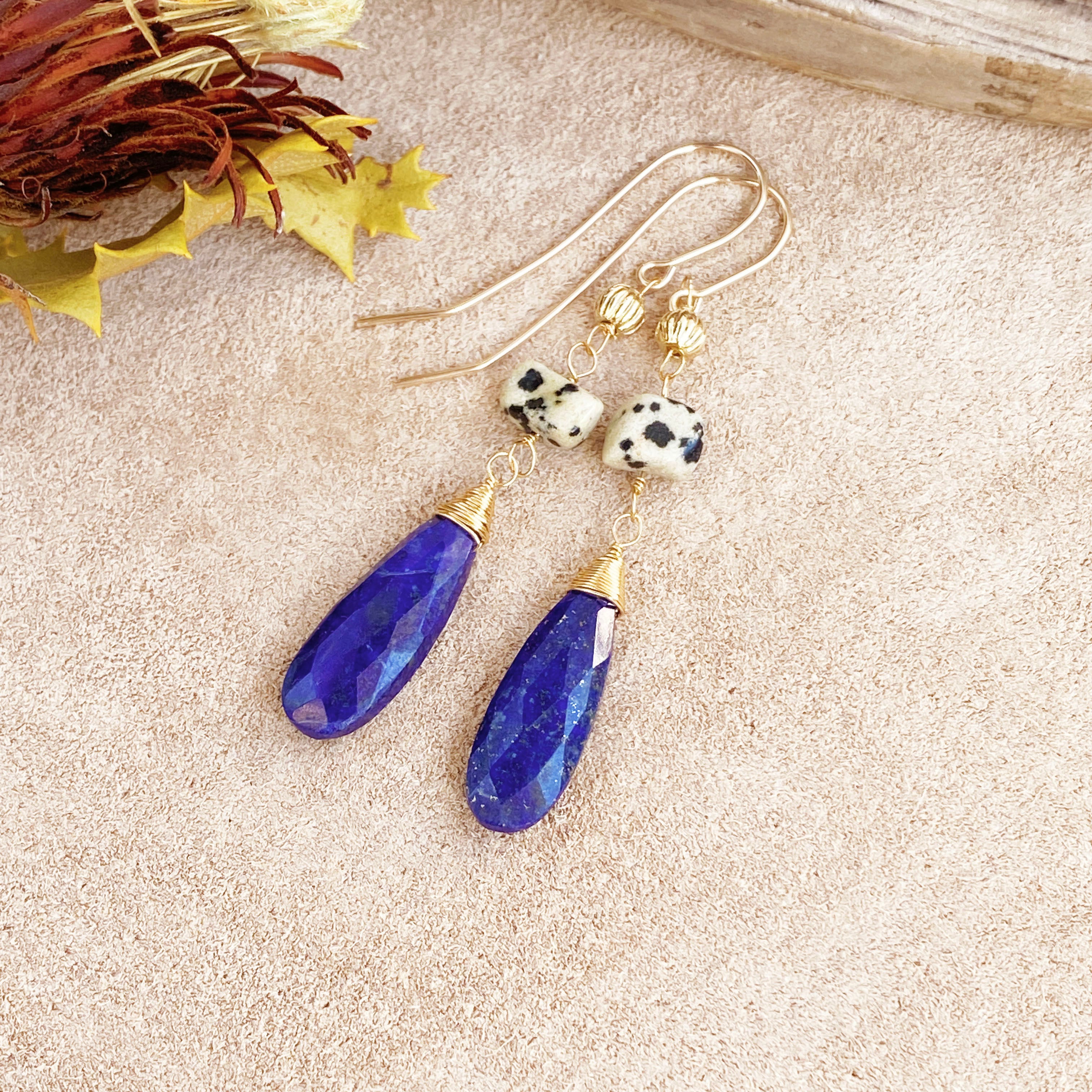 ロングペアシェイプ のラピスラズリとダルメシアンジャスパーを組み合わせたピアスです。